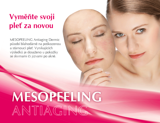 MESOPEELING AntiagingMESOPEELING Antiaging Dermic působí blahodárně na poškozenou a stárnoucí pleť. Vynikajících výsledků je dosaženo u pokožky se skvrnami či jizvami po akné. Jedná se o kombinaci 2 technik: chemického peelingu, který působí bezpečně a kontrolovaně, a neinvazivní mezoterapie. Výsledky jsou viditelné již po prvním ošetření. Pleť je po aplikaci výrazně mladší, jasnější a různé nedostatky jsou odstraněny. Jedná se o rychlé a bezbolestné ošetření, které je možné aplikovat během celého roku na jakýkoliv typ pokožky. Chemický peelingJe nechirurgické ošetření, jehož výsledkem je šetrná exfoliace vnější vrstvy pokožky, čímž se napomáhá k její rychlejší obnově. Aplikuje se za účelem zlepšení stavu pleti poškozené sluncem, k odstranění vrásek, zlepšení stavu jizev po akné nebo neštovicích a zesvětlení či dokonce odstranění skvrn. Chemický peeling je často doporučován na pleť stárnoucí v důsledku věku či slunečního záření a na pleť s akné a skvrnami, ale je vhodné jej použít také jako prostředek pro udržení zdravějšího, pevnějšího a čistého vzhledu pleti. Neinvazivní mezoterapieAplikovaná v programu "Mesosystem Antiaging" působí proti známkám stárnutí. Mezoterapie spočívá v použití proudů na střední frekvenci, díky nimž dochází k otevření vstupní cesty přes mikropóry do buněčné membrány, což má za následek proniknutí aktivních látek do pokožky. Průběh ošetřeníOšetření trvá celkem přibližně 30 - 45 minut, kdy je nejdříve pleť odlíčena a vyčištěna a následně je proveden chemický peeling. Poté se provádí "anti-aging" neinvazivní mezoterapií. Na závěr se aplikuje speciální pleťová maska. Po ošetření je pleť ošetřena krémem se slunečním ochranným faktorem. Během ošetření může klient cítit míirný pocit tepla či lehkého pálení. Ve výjimečných případech může dojít k začervenání pokožky, které ale během několika málo následujících hodin zmizí. Po ošetření se klient může nalíčit a vrátit se do běžného života. Po dobu cca 48 hodin od ošetření by klient neměl podstupovat žádná jiná profesionální ošetření pleti tak, aby pokožka absorbovala aplikované aktivní látky a odpočinula si.
